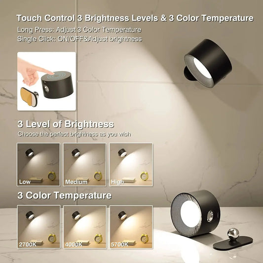 Modern LED Wall Sconces Lamp, 2000mA Battery USB Charging, Touch Controlled 3-level Brightness Modes, 360 Degree Free Rotation